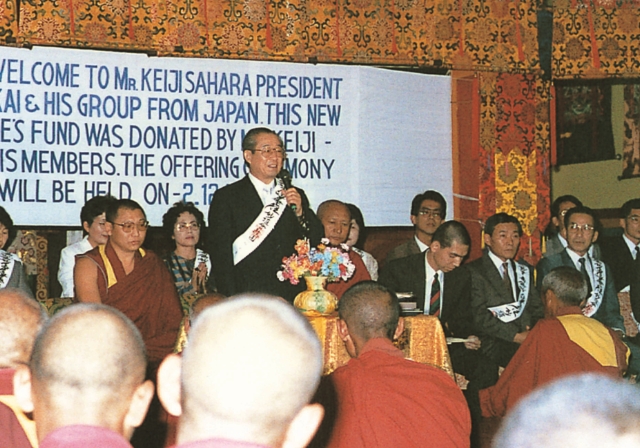 インド南部にあるギュメ密教大学では、約400名の僧侶が勉学、修行に励む仮学舎の老朽化が進み、教団をはじめ、仏教関係者が資金協力し、復旧へ。「妙道会館」建設(1988)、「厨房施設」建設(1990)
